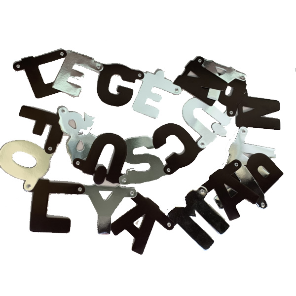 Girlanda, nápis LEGÉNYBÚCSÚ FOLYAMATBAN, z papiera. Dĺžka: 2 m, výška písmen 11 cm. Strieborno-čierna farba. Na požiadanie z rôznych farieb alebo jednofarebný nápis.