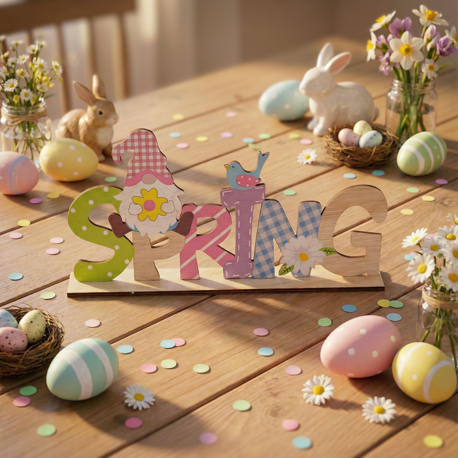 Oživte svoj sviatočný stôl touto veselou jarnou dekoráciou s trpaslíkom! Drevená stolová ozdoba v tvare nápisu „SPRING“ je doplnená o roztomilého trpaslíka, vtáčika a jarné kvety. Dekoráciu môžete jednoducho umiestniť na stôl, policu alebo komodu a okamžite vytvorí sviatočnú atmosféru vo vašej domácnosti. Vďaka odolnému drevenému materiálu si zachová svoj pôvab po dlhý čas a dá sa používať opakovane každý rok.