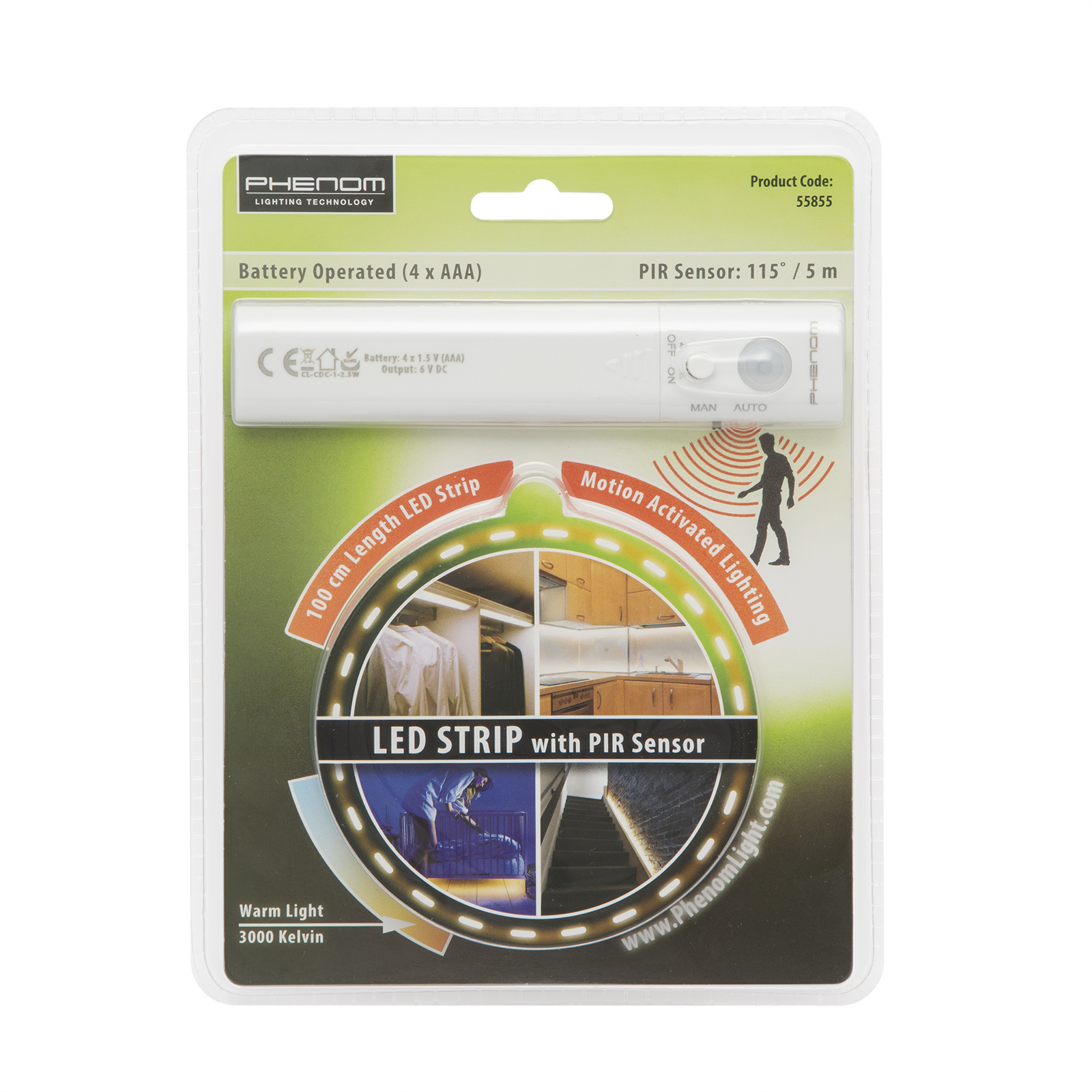 4. LED pásik a pohybový senzor (dosah a uhol: 5, 115°) prilepte pomocou obojstrannej lepiacej pásky, ktorá je aplikovaná na zadnej strane pásiku, na želané miesto.
