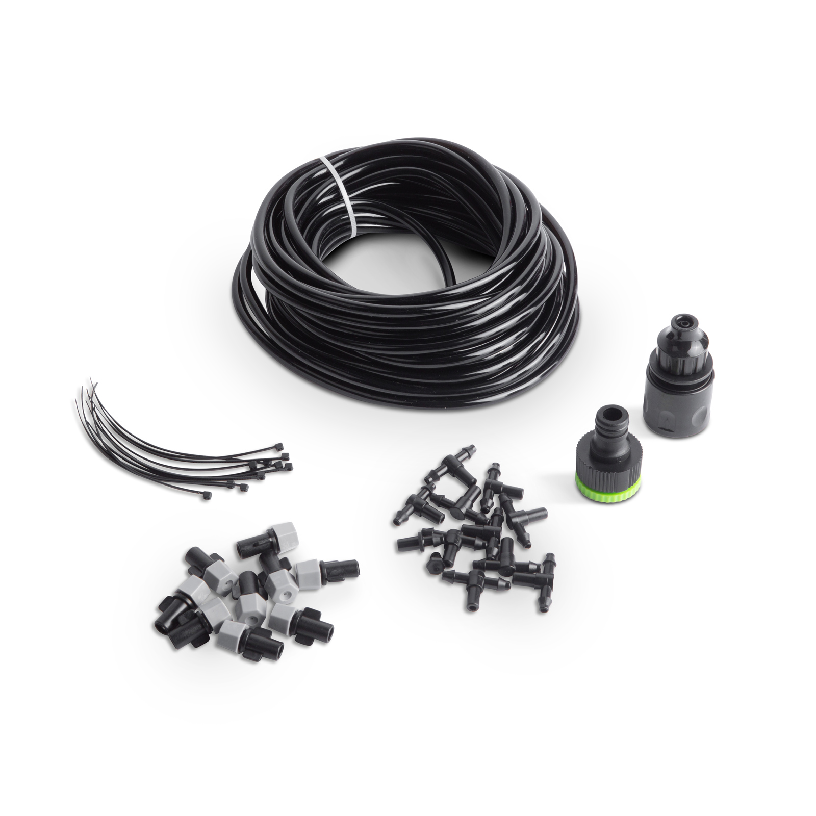 | Počet konektorov: | 1 ks adaptér na kohútik (pre kohútik s vonkajším závitom 1/2" - 3/4") 1 ks rýchlospojka 10 ks "T" tvar 10 ks tryska / rozprašovacia hlava 1 ks koncový uzáver 3 ks gumené tesnenie |