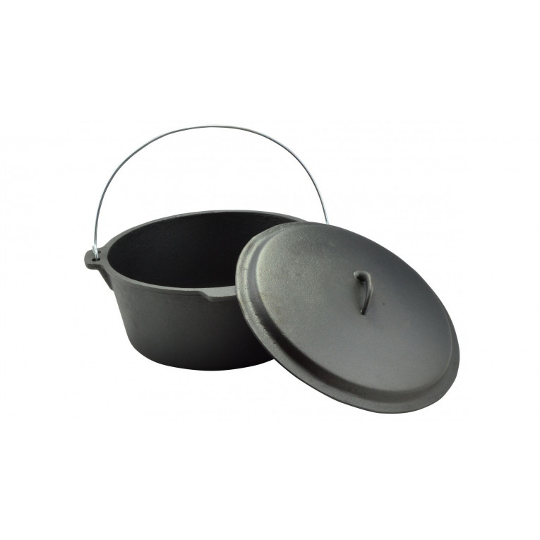 Materiál: liatina, ošetrená rastlinným olejom. Rozmery: priemer 29,5 cm; šírka 36 cm; výška bez pokrievky 13,5 cm; výška s pokrievkou 19,5 cm Rozmery balenia: 34*34*15 cm Objem: 8 litrov Hrubá hmotnosť: 9,6 kg Čistá hmotnosť: 8,5 kg Možné použiť: na všetkých typoch varných plôch (plynových, elektrických, sklokeramických, indukčných), na otvorenom ohni, uhlíkoch, v peci, v elektrickej aj plynovej rúre Čistenie: Po každom použití umyte teplou vodou s čistiacim prostriedkom, osušte a potrite tukom, aby ste predišli hrdzaveniu. Použitie: Pred prvým použitím odstráňte z nádoby rastlinný olej, ktorý chráni pred hrdzou. Nádobu umyte v horúcej vode s neutrálnym tekutým čistiacim prostriedkom a osušte. Potom nádobu potrite tukom alebo slaninou a dôkladne zohrejte.