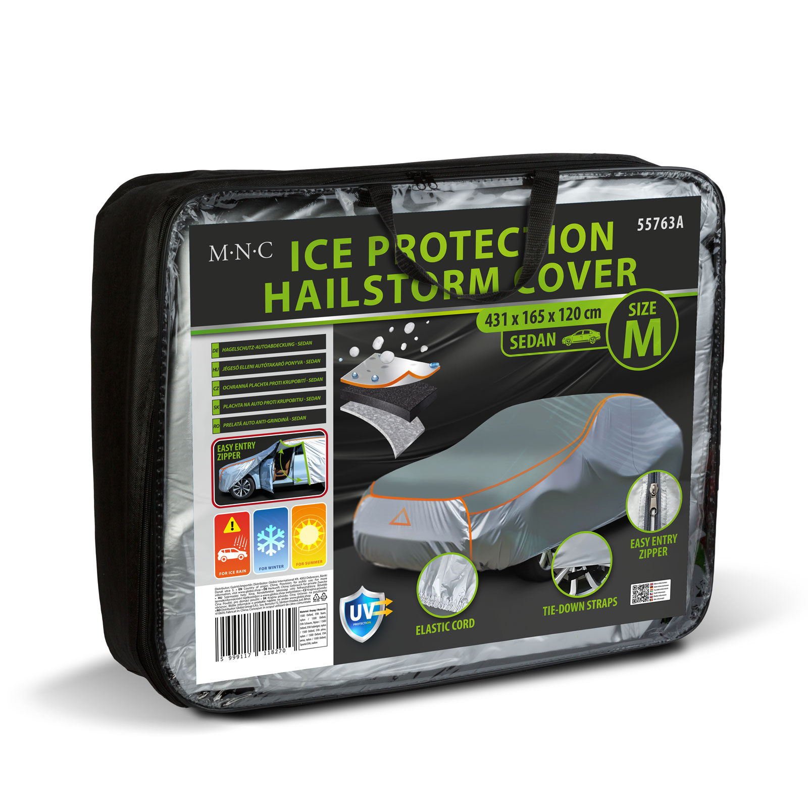 Chráňte svoje auto pred nepriaznivým počasím s touto vysokokvalitnou plachtou proti krupobitiu! Plachta poskytuje úplnú ochranu pred krupobitím, UV žiarením, dažďom a prachom, čím dlhodobo chráni karosériu a lak vášho vozidla. Kryt je vyrobený z tkaniny Oxford 150D a 4 mm hrubej vrstvy EVA peny, ktorá účinne tlmí nárazy spôsobené ľadom a vetvami stromov a zároveň zabezpečuje správne vetranie. Použitím je možné predísť poškodeniu a znečisteniu karosérie. Vstavané trojuholníkové reflexné logo zlepšuje viditeľnosť a dva upevňovacie popruhy zaisťujú, že plachta zostane stabilne na svojom mieste aj pri silnom vetre. Pomocou bočného zipsu sa môžete ľahko dostať do vozidla bez odstránenia plachty.
