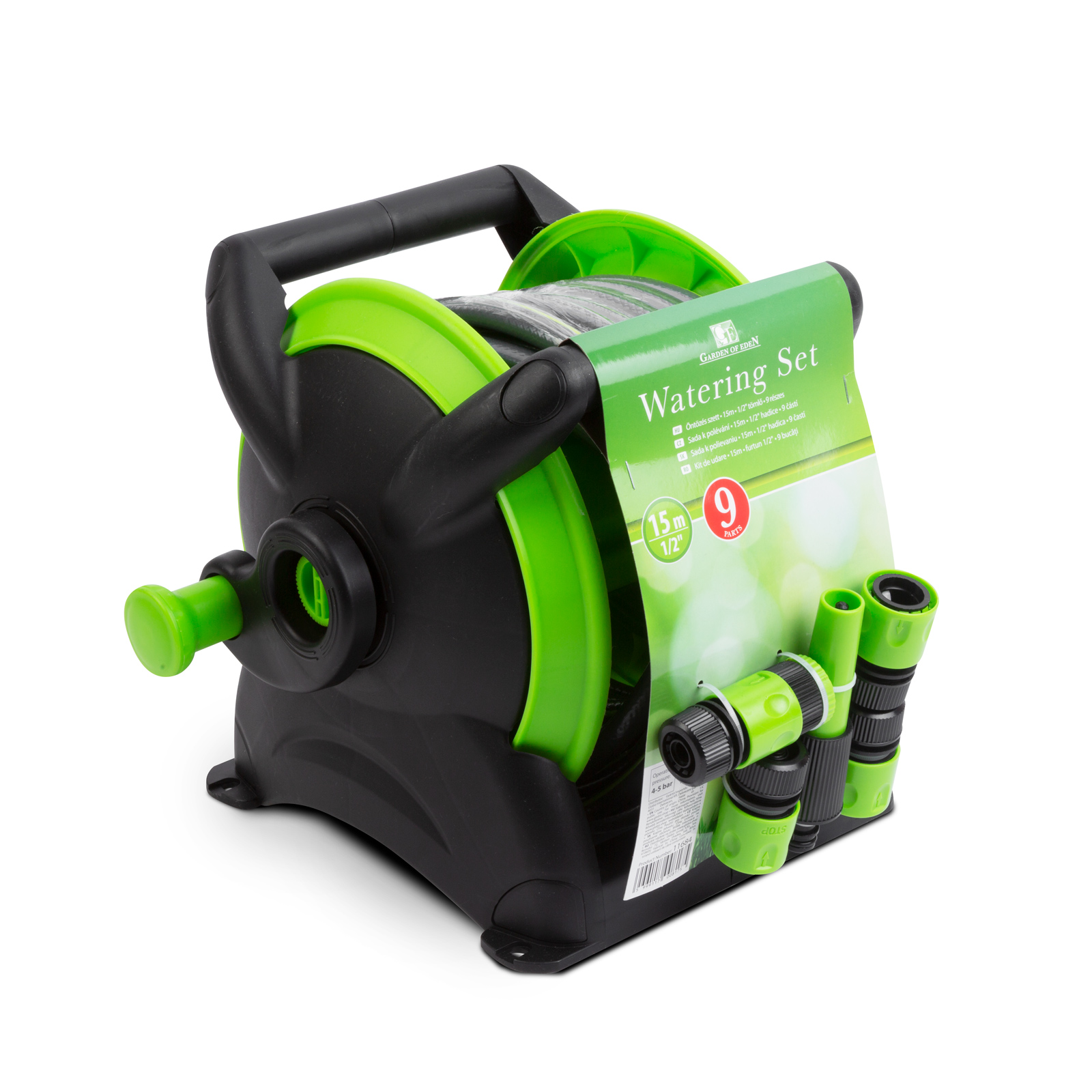 | Príslušenstvo: | 15 m 1/2" hadica 1 ks úložný bubon 4 ks rýchlospojka na hadicu 1 ks 3/4" spojka na hadicu + 1/2" adaptér 1 ks tryska |