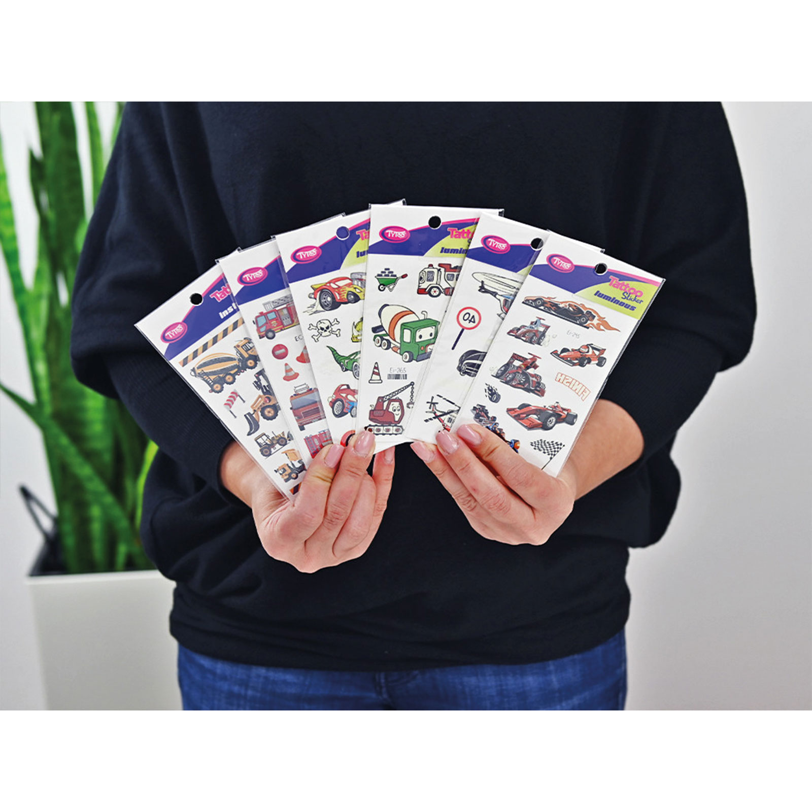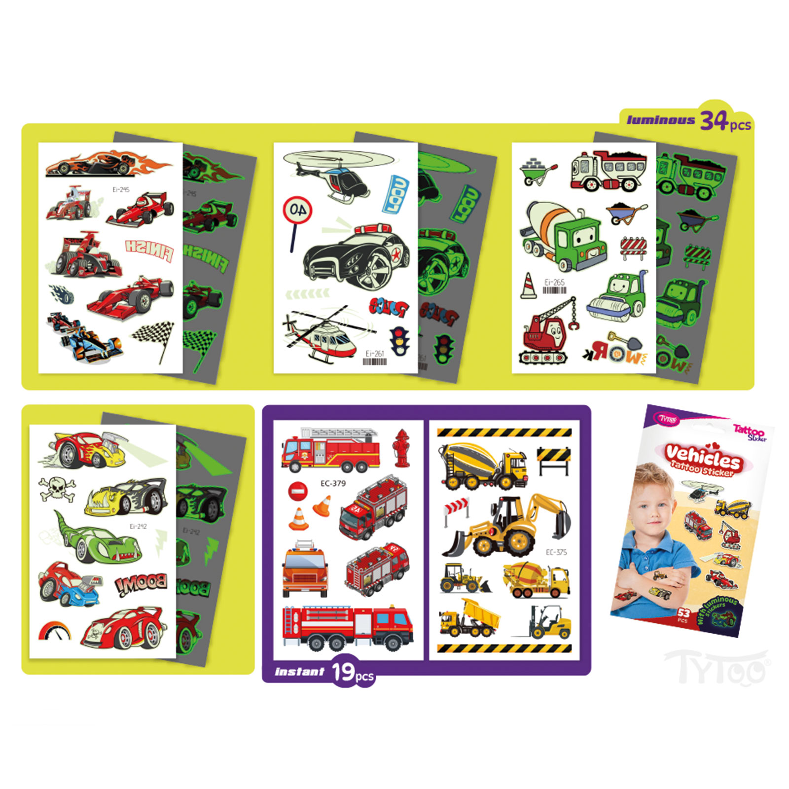 Všetko čo sú autá! Ľahko nanášateľné, jednoduché a pekné tetovania so vzormi áut v jednej sade.Tieto dočasné tetovačné nálepky majú výbornú kvalitu, zachovajú si tak svoju živú farbu a bohatosť detailov dlhší čas, dokonca aj niekoľko dní.Ľahko sa nanášajú a odstraňujú bez podráždenia alebo poškodenia pokožky.53 ks nálepok so vzorom áut na 6 listoch:športové autá, svietiace autá,pracovné stroje, hasiace a policajné autá.