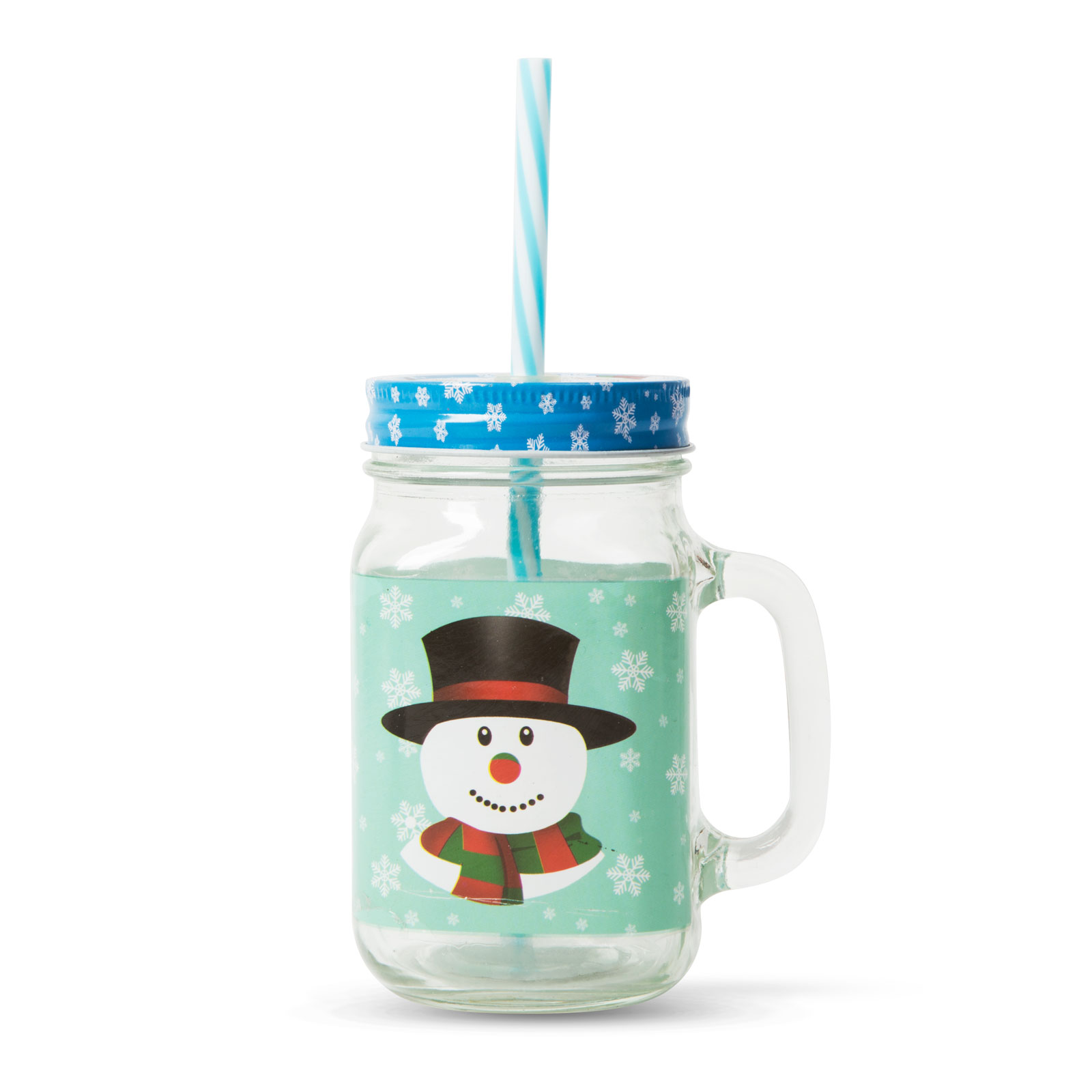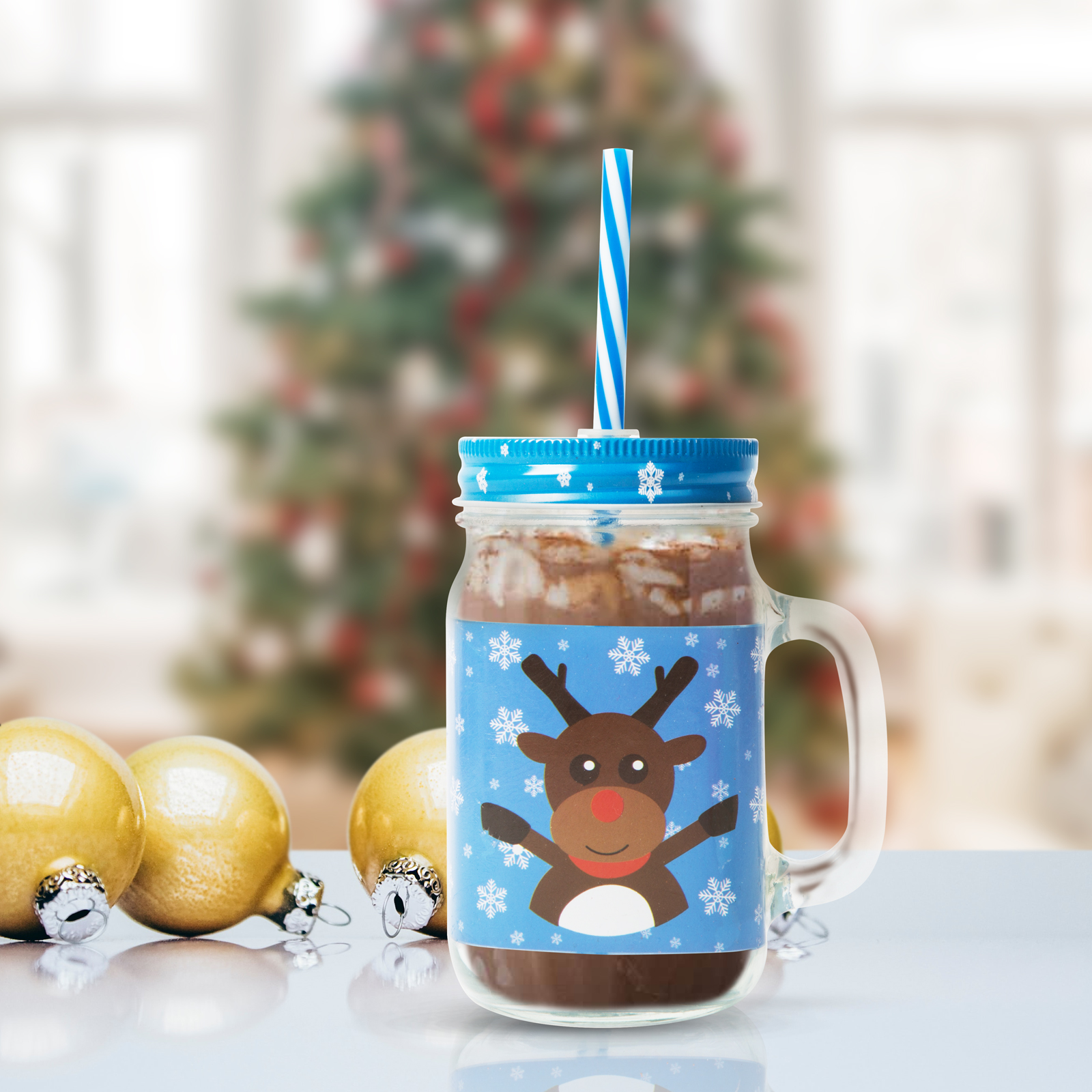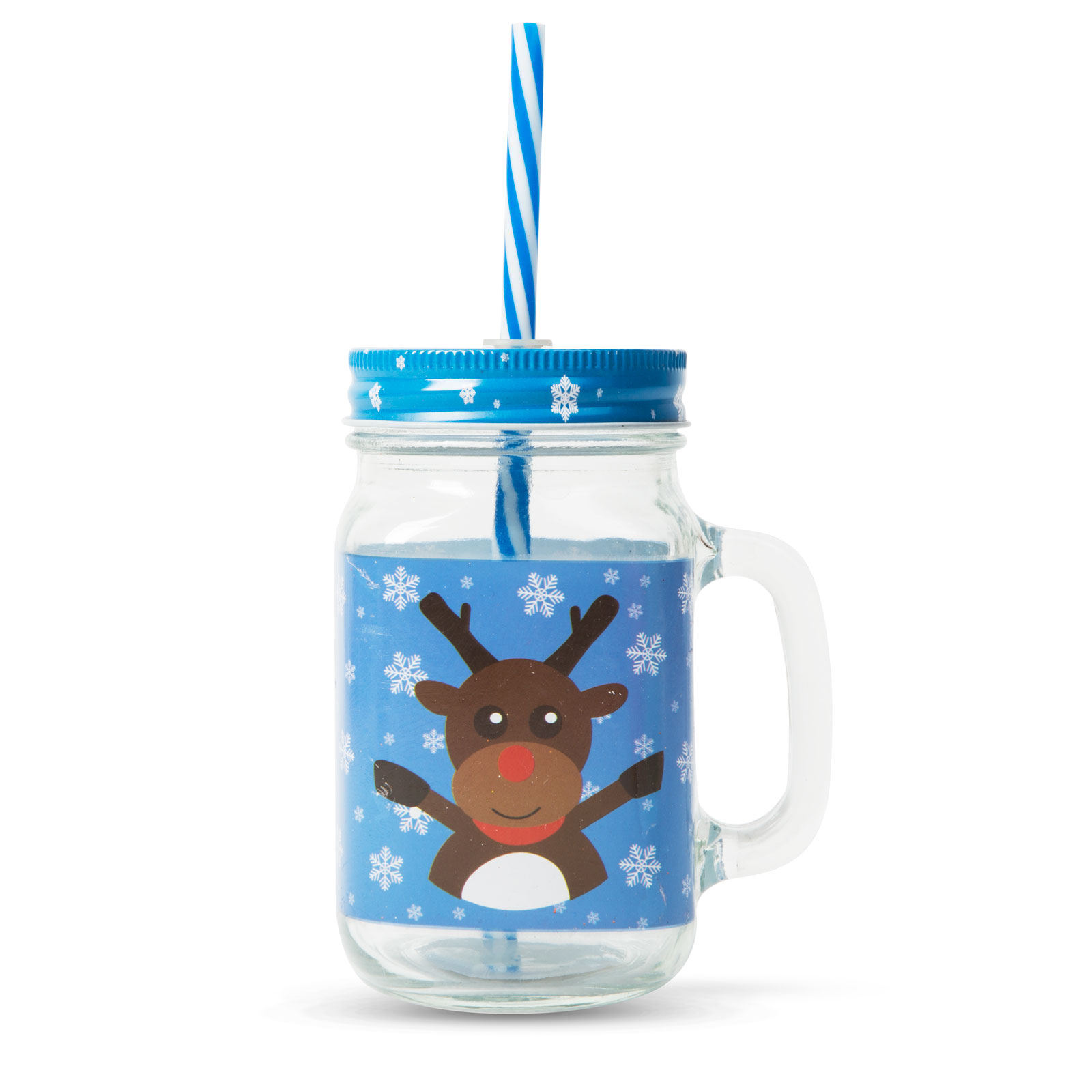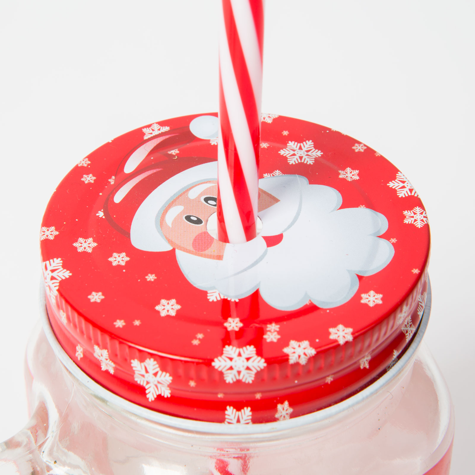 Sklenený pohár s veselým vianočným vzorom:Mikuláš, snehuliak, sob, v rôznych farbách s kovovým vrchnákom.