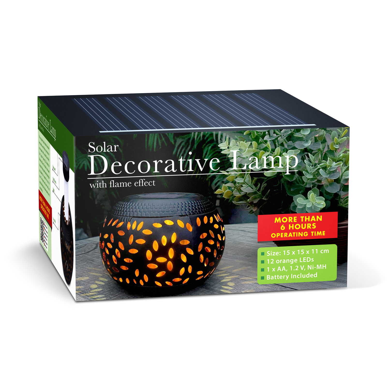 Táto atmosférická, guľová vonkajšia dekoratívna lampa s realistickým efektom plameňa vytvára teplé svetlo na vašej terase alebo v záhrade. Dvanásť žltých „tancujúcich“ LED diód imituje mihotanie plameňa. Zabudovaný 45 × 45 mm solárny panel počas dňa nabíja vysokokapacitnú batériu, takže lampa môže svietiť až 6–8 hodín. Elegantný kovový vonkajší plášť vytvára pôsobivý vzor svetla a tieňa v okolí.