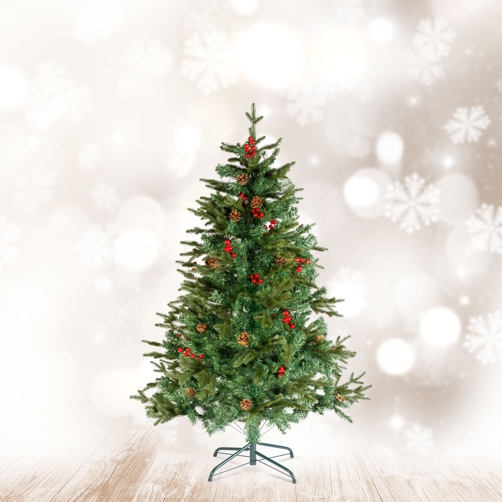 Vytvorte si útulnú sviatočnú atmosféru vo svojom domove s týmto klasickým zeleným umelým stromčekom! Husté vetvenie, bohaté realistické ihličie a červené bobule vytvárajú prirodzený vzhľad, čím predstavujú dokonalú alternatívu k živému stromčeku. Umelý stromček vyrobený z odolného materiálu si zachová svoju krásu po mnoho rokov a zároveň nestráca ihličie.
