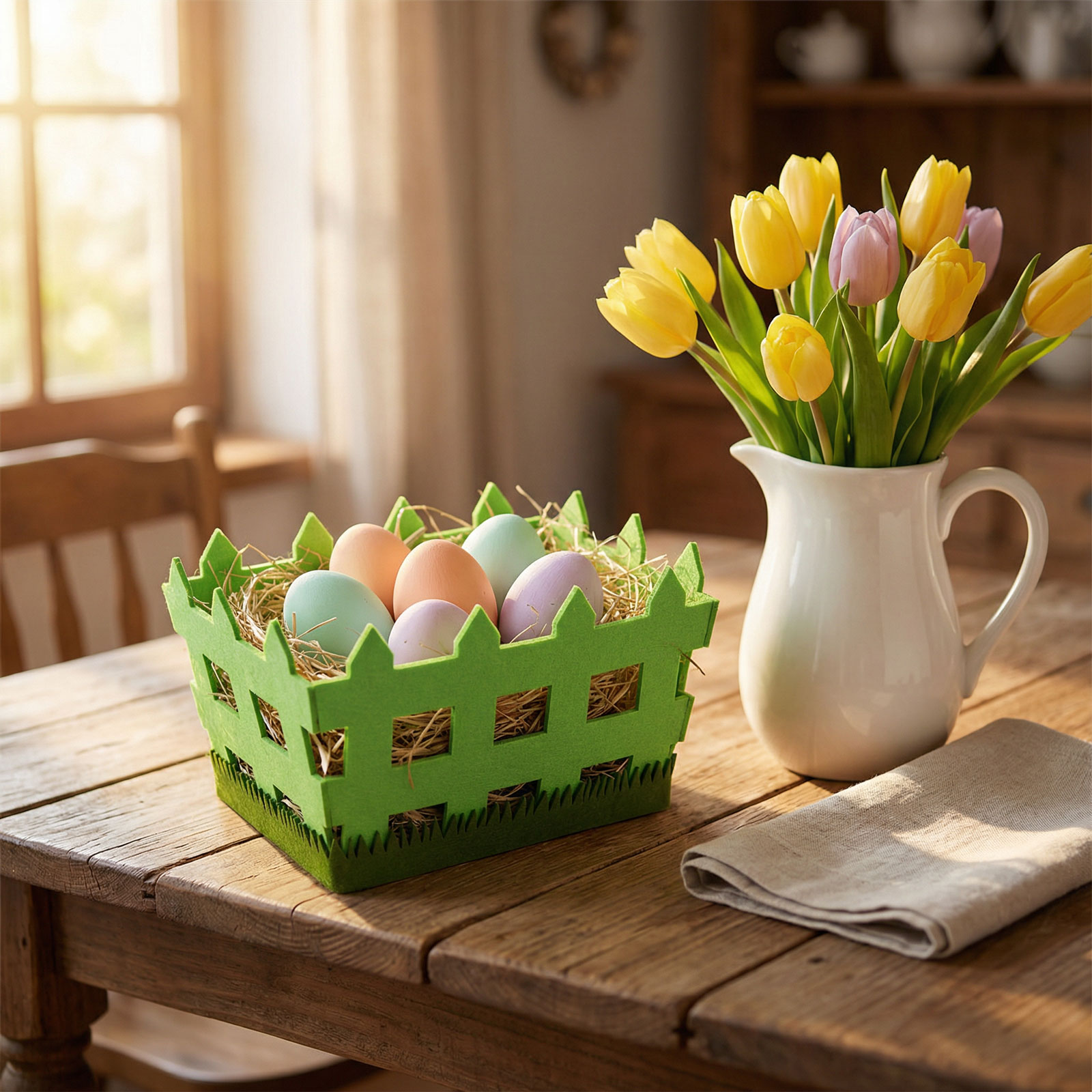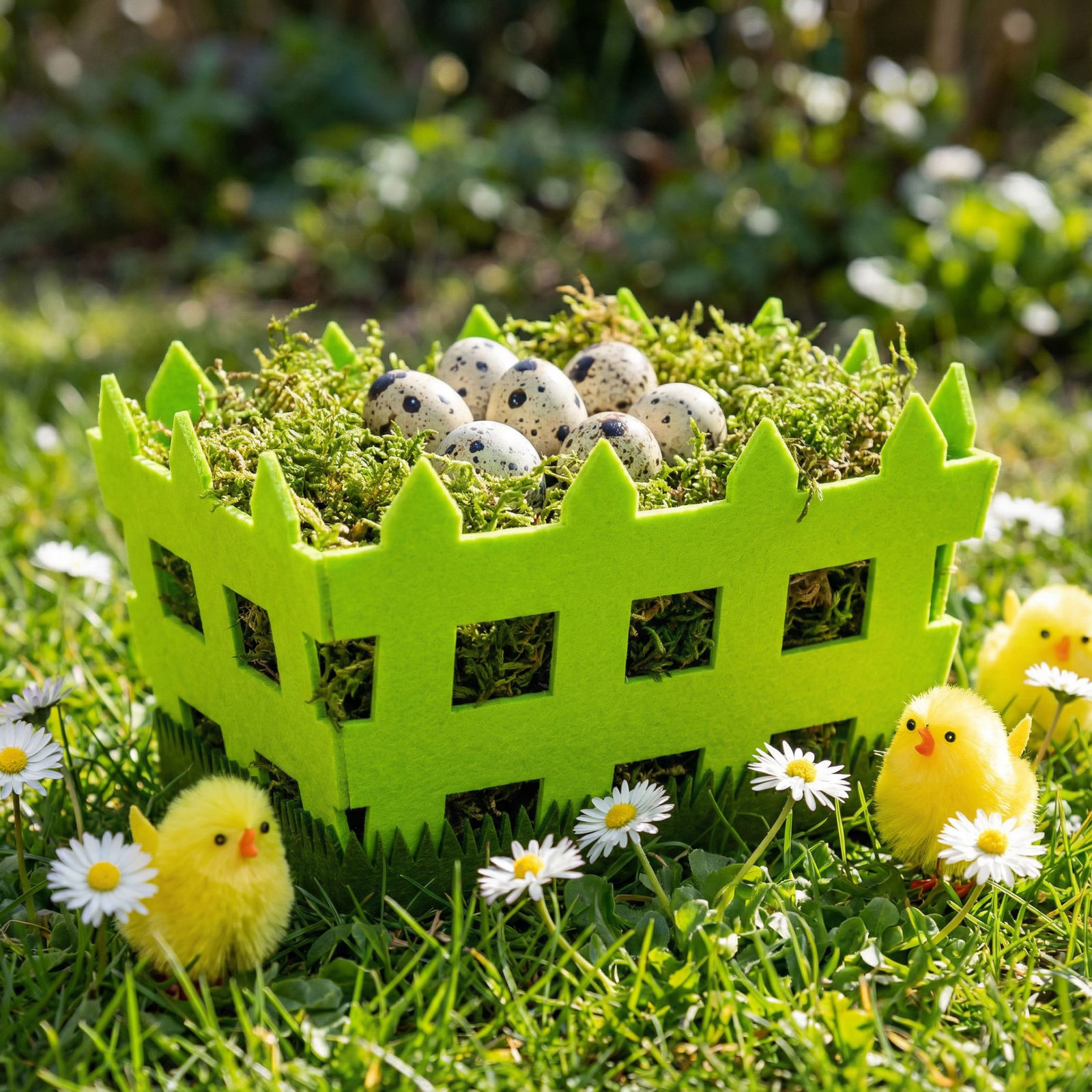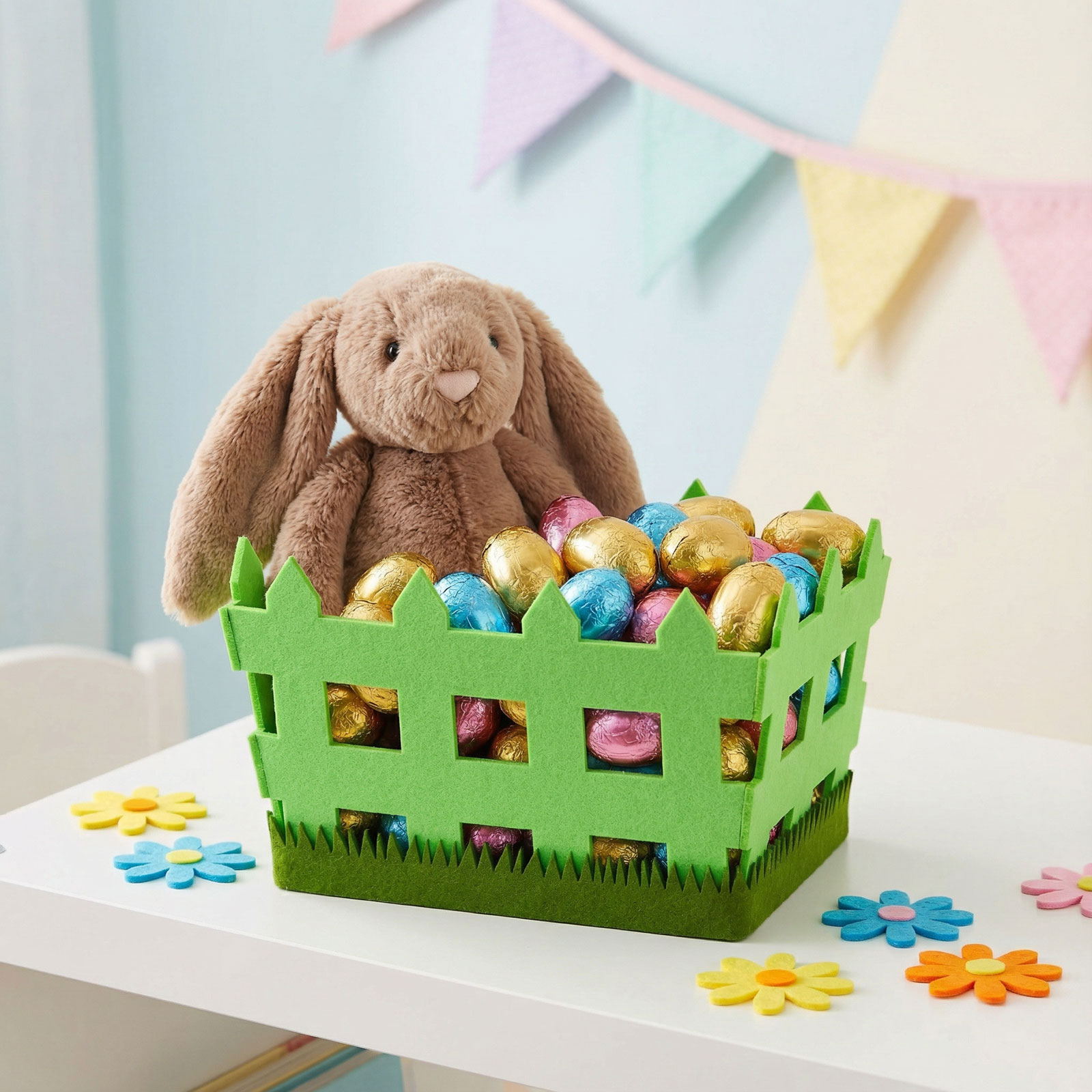 Oživte svoju veľkonočnú výzdobu týmto jedinečným filcovým košíkom v tvare plota! Košík je ideálny na uskladnenie a podávanie sladkostí, drobných darčekov alebo veľkonočných vajíčok. Filcový materiál je ľahký, no zároveň odolný, a tvar plota dodáva dekorácii veselý, jarný nádych. Perfektný doplnok na sviatočný stôl, darčekové koše alebo akúkoľvek veľkonočnú dekoráciu.