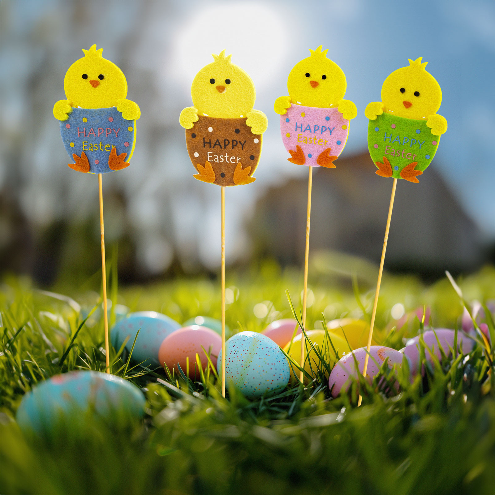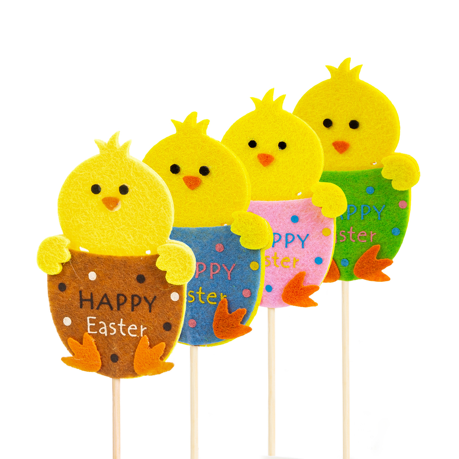 Veselé veľkonočné kuriatka, ktoré je možné zapichnúť do kvetináča izbových rastlín alebo do malých záhrad či kvetinových záhonov. Kuriatka umiestnené na drevených špajliach sú vyrobené z dreva. Ideálna dekorácia na ozdobenie bytu alebo záhradky počas veľkonočných sviatkov.