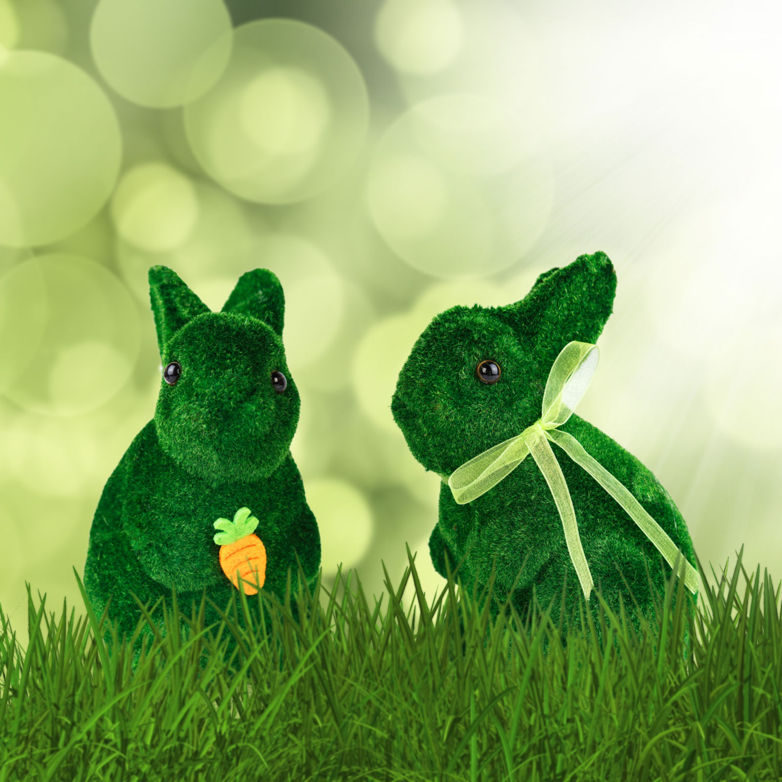 S týmto nádherným veľkonočným zajacom môžete jednoducho vytvoriť jedinečnú atmosféru vo vašej domácnosti. Vzhľad podobný umelej tráve a plyšový povrch povyšujú sviatočnú dekoráciu na vyššiu úroveň. Kompaktná veľkosť zajaca umožňuje jeho ľahké umiestnenie na akúkoľvek skriňu, policu alebo do stredu veľkonočného stola.