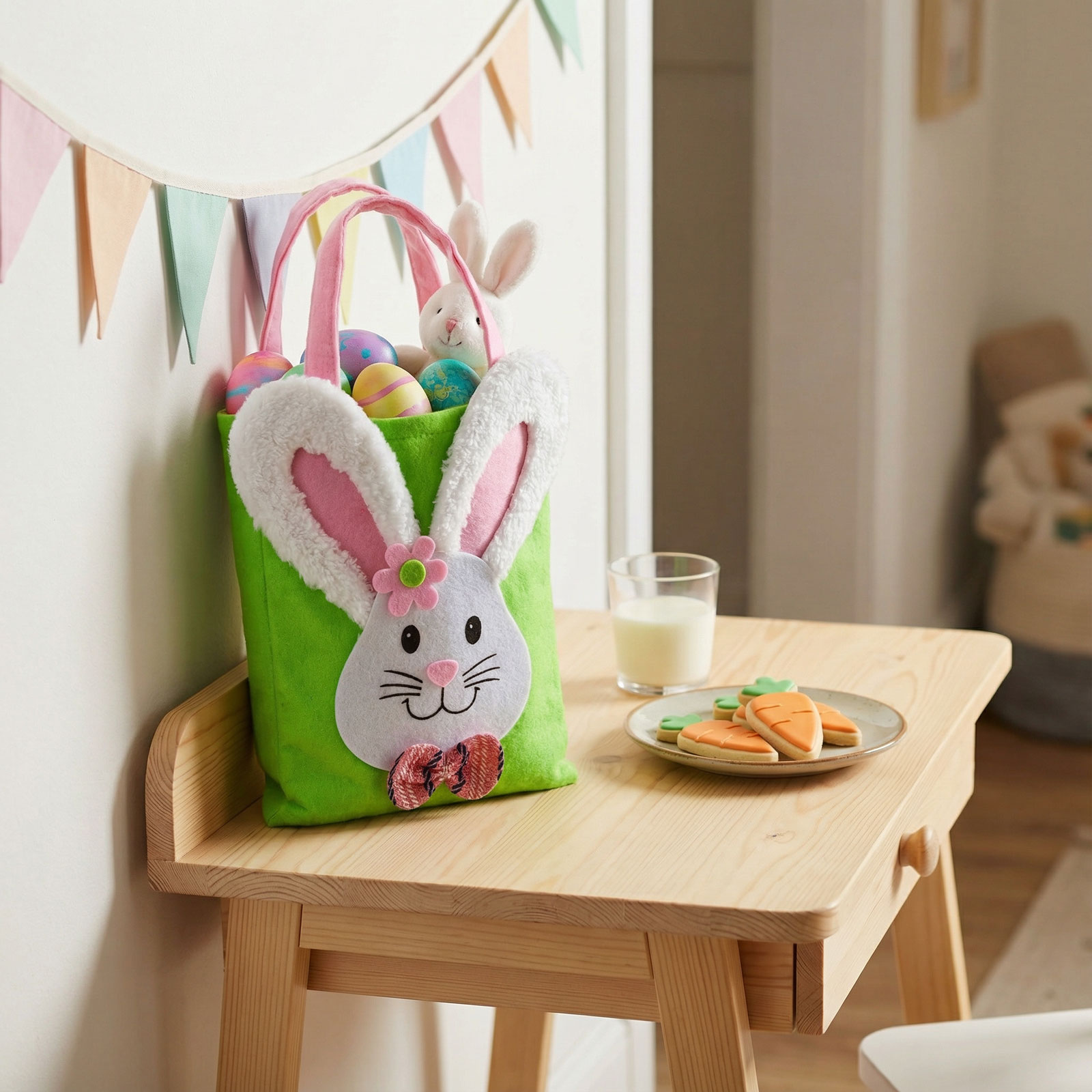 Vneste veselú atmosféru do veľkonočných príprav s touto rozkošnou filcovou taškou so zajačikom! Taška je vyrobená z mäkkého filcu a polyesteru, zdobená roztomilým motívom zajačika a nadýchanými uškami. Dostupná je v dvoch farbách – zelenej a ružovej. Ideálna voľba pre deti na zbieranie veľkonočných vajíčok, čokolády alebo darčekov, no skvele poslúži aj ako sviatočná dekorácia. Vďaka pevnému prevedeniu si dlhodobo zachováva svoj tvar.