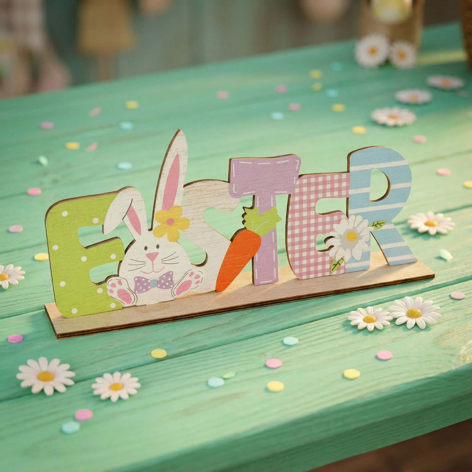 Oživte svoj sviatočný stôl touto veselou veľkonočnou dekoráciou so zajačikom! Drevená stolová ozdoba v tvare nápisu „EASTER“ je doplnená o roztomilého zajačika, mrkvu a jarné kvety. Dekoráciu môžete jednoducho umiestniť na stôl, policu alebo komodu a okamžite vytvorí sviatočnú atmosféru vo vašej domácnosti. Vďaka odolnému drevenému materiálu si zachová svoj pôvab po dlhý čas a dá sa používať opakovane každý rok.