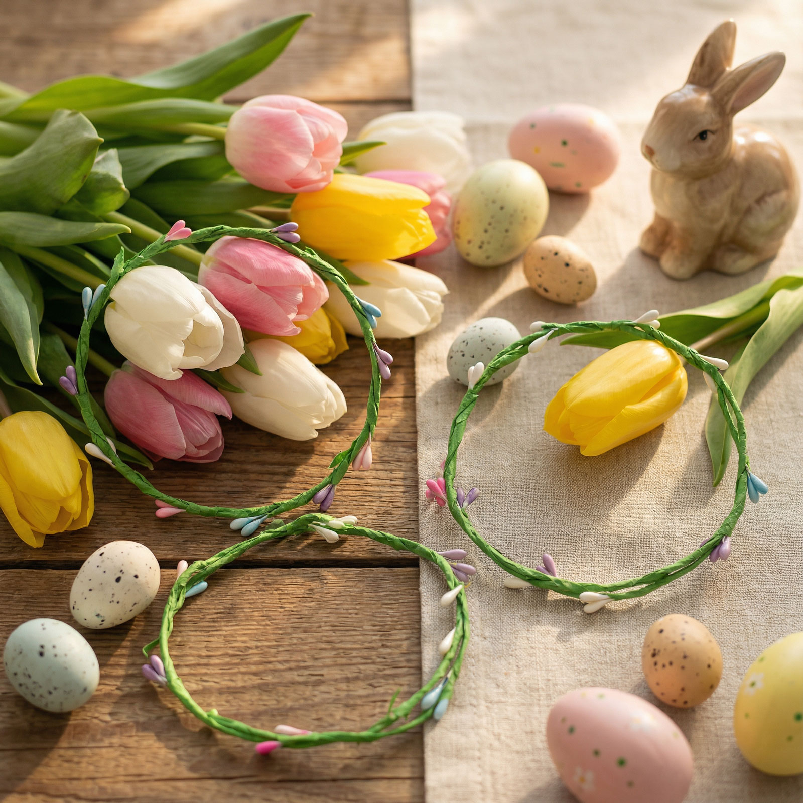 Rozžiarte svoj domov týmto veselým, farebným veľkonočným vencom! Dekoratívny veniec je ozdobený malými pastelovými púčikmi, ktoré dodávajú každej miestnosti sviežu a jarnú atmosféru. Ideálny na zavesenie na dvere, okná, steny alebo ako stolová dekorácia. Vyrobený z odolného materiálu, takže sa dá používať rok čo rok. V balení sa nachádzajú 4 vence, ktorými môžete ozdobiť viac miestností, kompozícií alebo darčekov.