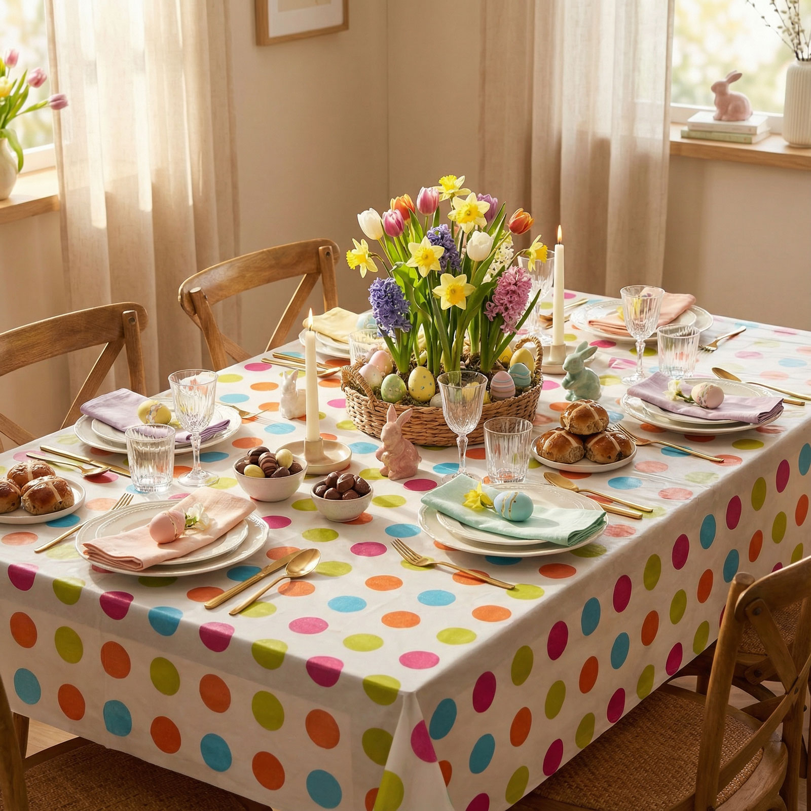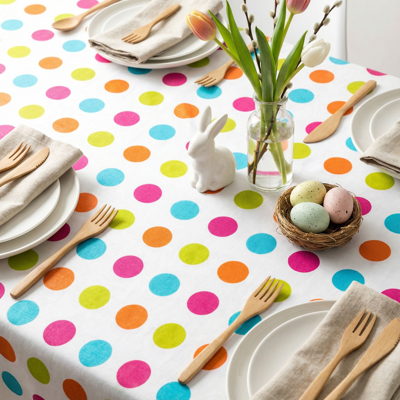 Oživte svoj sviatočný stôl touto praktickou a dekoratívnou veľkonočnou obrusou! Obrus s flanelovou zadnou stranou je ideálnou voľbou pre veľkonočné oslavy, sviatočné obedy a večere. Jeho veselý, farebný vzor okamžite navodí sviatočnú atmosféru, zatiaľ čo flanelový materiál chráni stôl pred nečistotami.