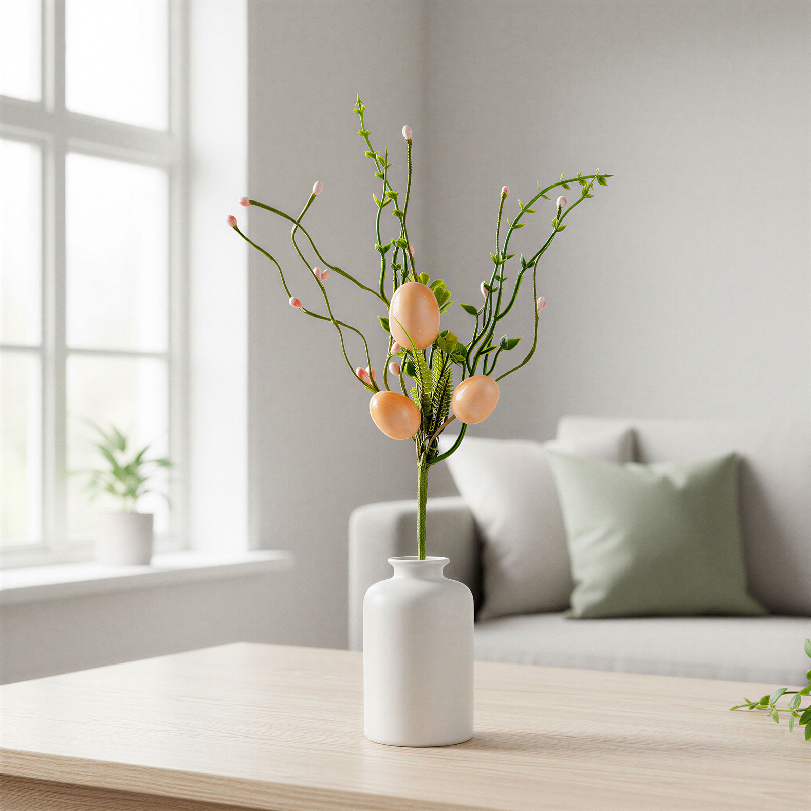 Táto dekoratívna veľkonočná vetvička s vajíčkami je ideálnou voľbou pre jarnú a veľkonočnú výzdobu vášho domova. Vetvička zdobená ružovými vajíčkami a zelenými listami vytvára veselú a sviatočnú atmosféru, ktorá sa skvele hodí do stolových aranžmánov, vencov, váz alebo dokonca ako dekorácia na darčekové balíčky. Vetvička s realistickým vzhľadom je vyrobená z odolného materiálu, takže ju možno používať opakovane každý rok. Vďaka detailnému spracovaniu harmonicky ladí s inými jarnými dekoráciami a oživí každý domov alebo kanceláriu.