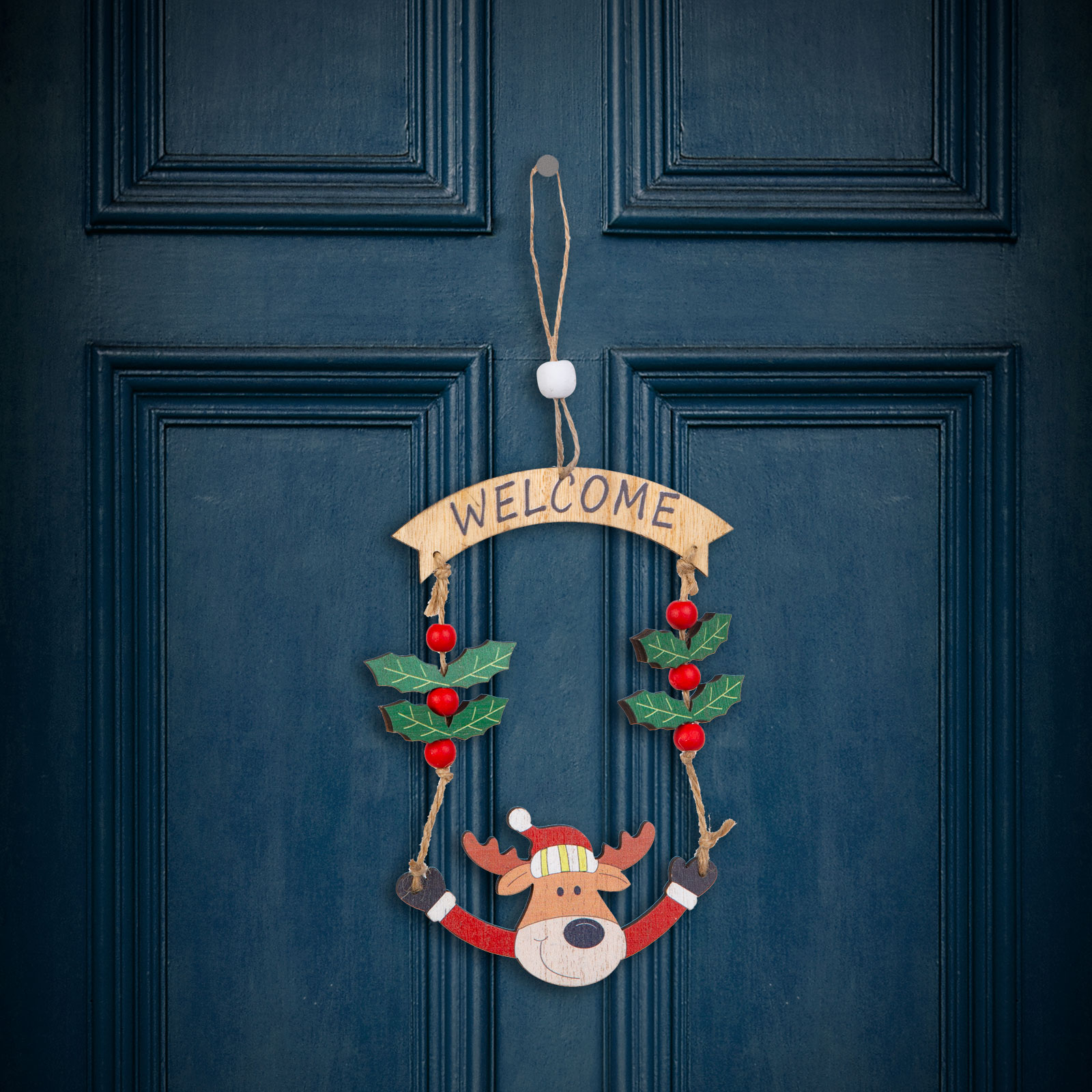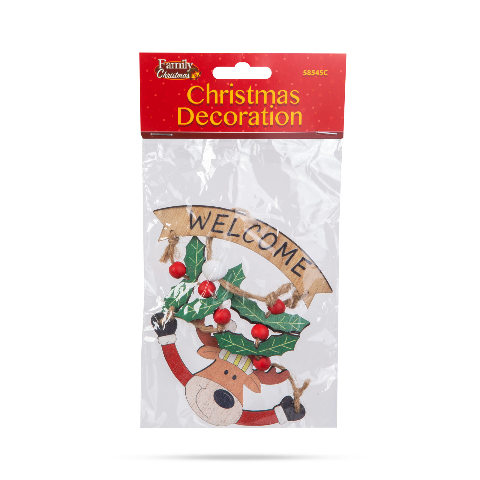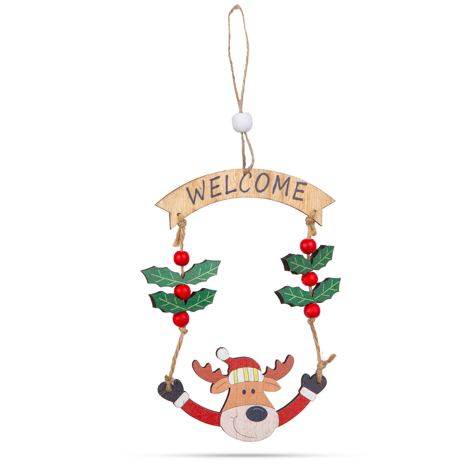 Táto krásna drevená figúrka soba môže byť dokonalým doplnkom k vianočnej výzdobe u vás doma. Figúrka je krásne spracovaná figúrka soba zdobená bobuľami a nápisom "Vitajte" na vyvolanie slávnostnej nálady a radosti. Drevené ozdoby prepožičiavajú teplo a prirodzenosť každej slávnostnej výzdobe. Prepracovaná, detailná maľba zaisťuje starostlivý a pútavý vzhľad. Figúrka je pevný, ale ľahký kus dreva, ktorý možno zavesiť kdekoľvek vo vašej domácnosti.