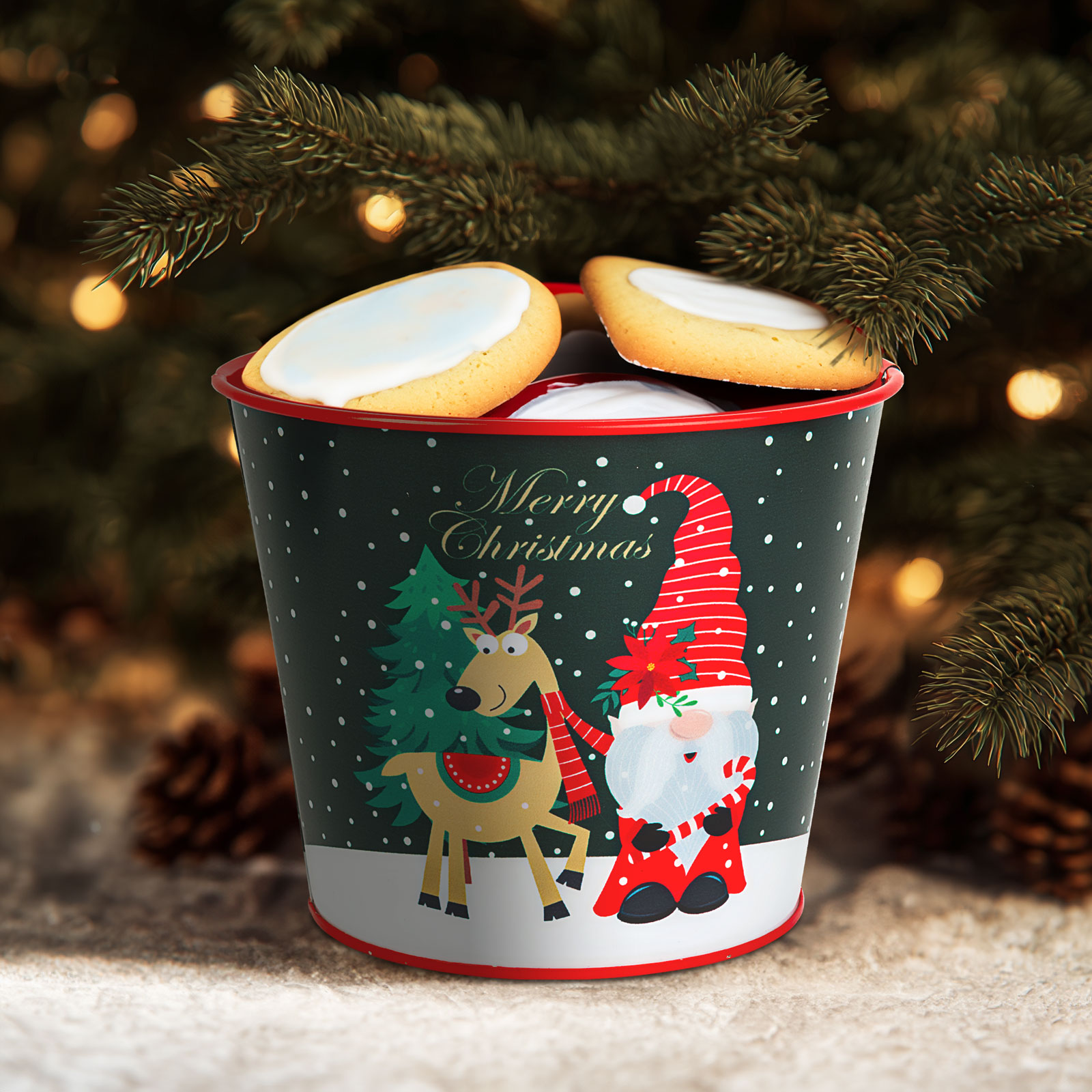 Tento červeno-zelený vianočný kovový kvetináč s motívom škriatka je veselým a príjemným doplnkom sviatočnej výzdoby. Motív usmiateho soba na zasneženom pozadí vytvára sviatočnú atmosféru v každej miestnosti. Možno ho použiť ako obal na kvetináč, na darčekové balenie alebo na uskladnenie drobných ozdôb či sladkostí. Vďaka pevnému kovovému materiálu ho môžete používať opakovane aj počas ďalších sviatkov.