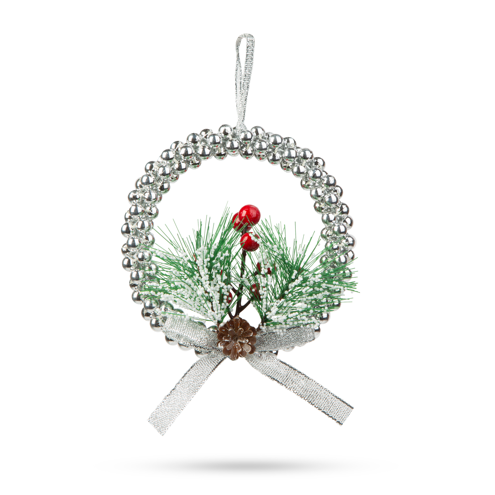 S týmto trblietavým strieborným vencom si ľahko vyzdobíte svoj domov počas vianočného obdobia! Pomocou strieborného vešiaka ho ľahko zavesíte na požadované miesto. Hodí sa ako ozdoba na vianočný stromček, ale aj ako ozdoba na dvere či do akejkoľvek vianočnej výzdoby. Pestrofarebné červené bobule, strieborná mašľa a zasnežené zelené konáre a šišky robia dekoráciu naozaj vianočnou. Veniec striebornej farby je univerzálny a nadčasový, takže dokonale ladí s akoukoľvek vianočnou dekoráciou a štýlom.