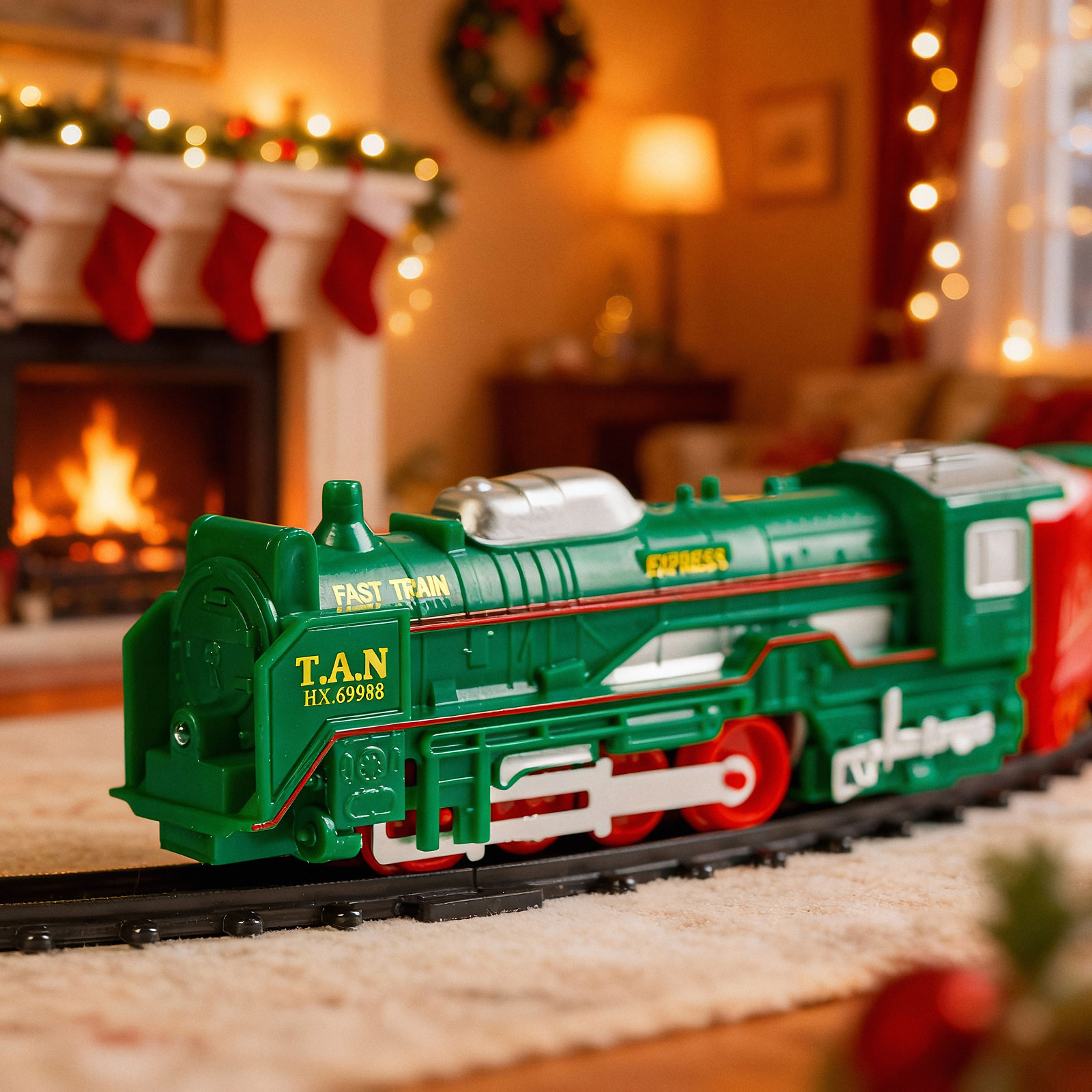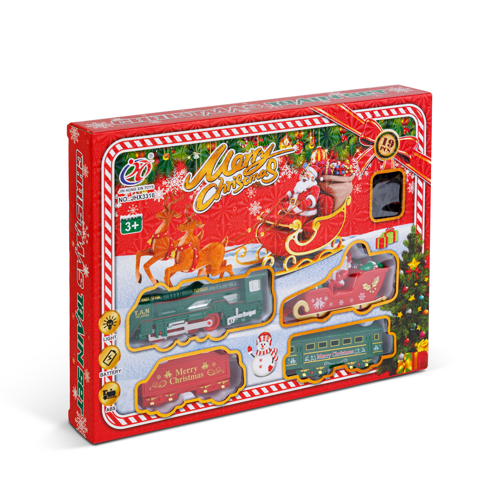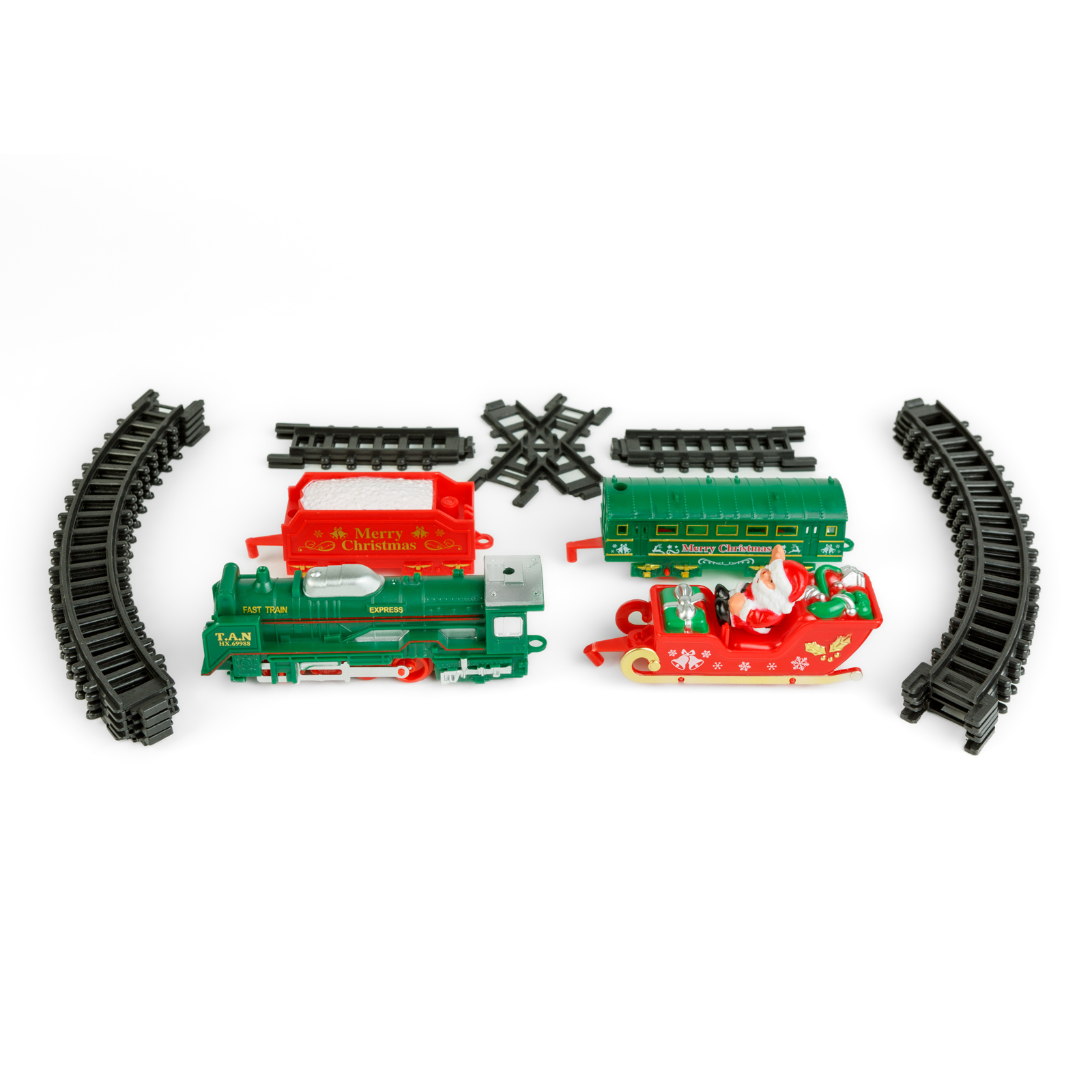 Obsah súpravy: | 1 lokomotíva – 13 cm 1 sane s Mikulášom – 9,5 cm 1 červený vagón – 8 cm 1 zelený vagón – 10 cm 15 ks koľajníc (10 ks oblúkových, 4 ks krátkych rovných, 1 ks križovatka) |