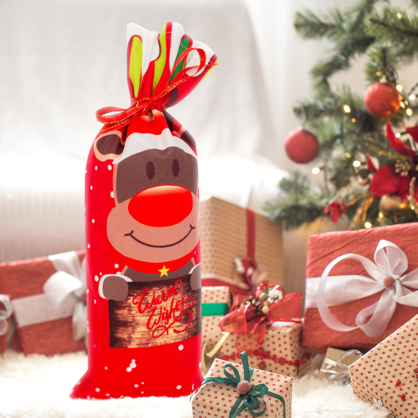 Darujte počas Vianoc štýlovo, oblečte svoje darčeky.Fľaše vložte do tejto polyestrovej tašky a uviežte mašľu zo stuhy na hrdlo fľaše.