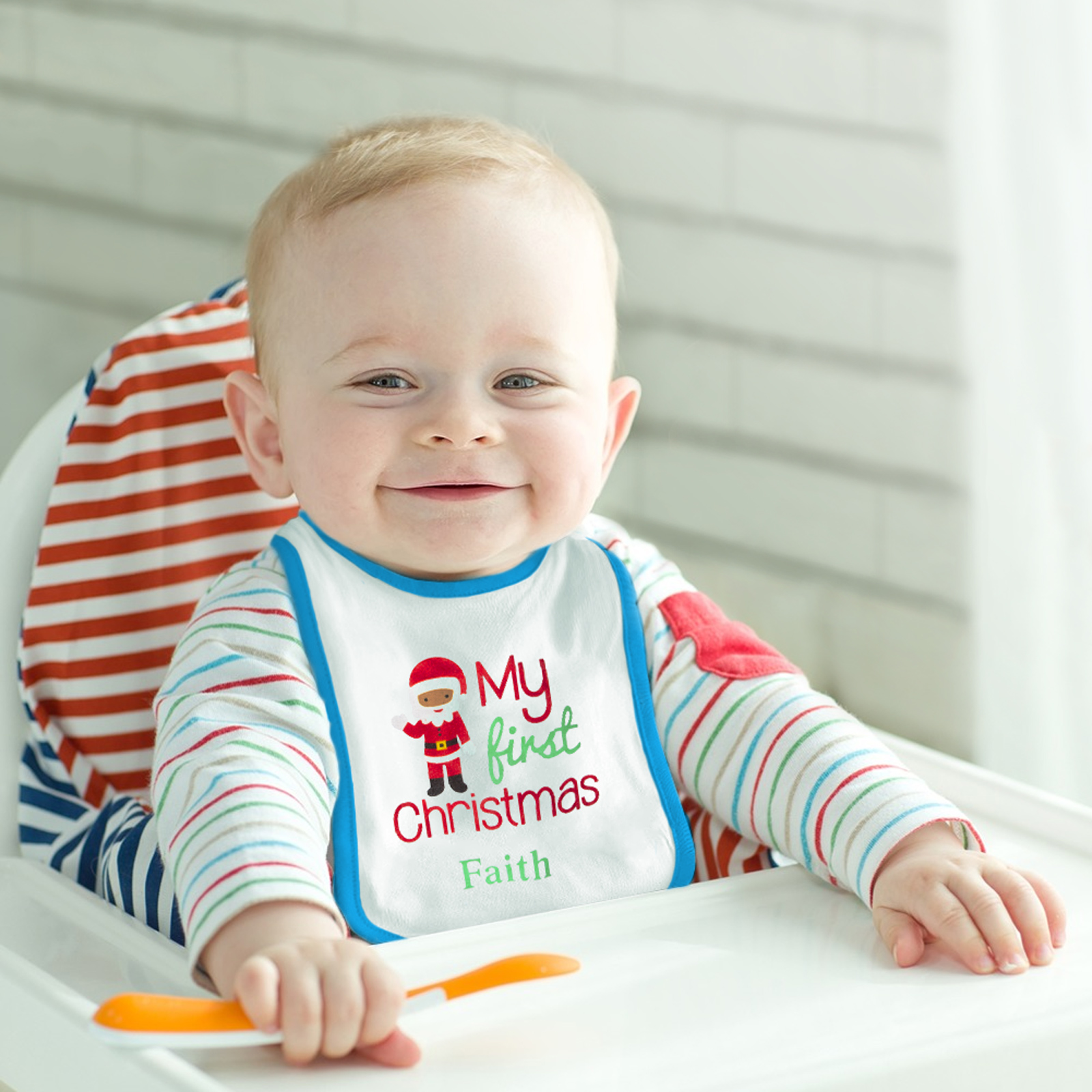 Praktické riešenie použiť podbradník na ochranu detského oblečenia. Veselé vianočné vzorované textílie si vaše dieťa určite obľúbiý