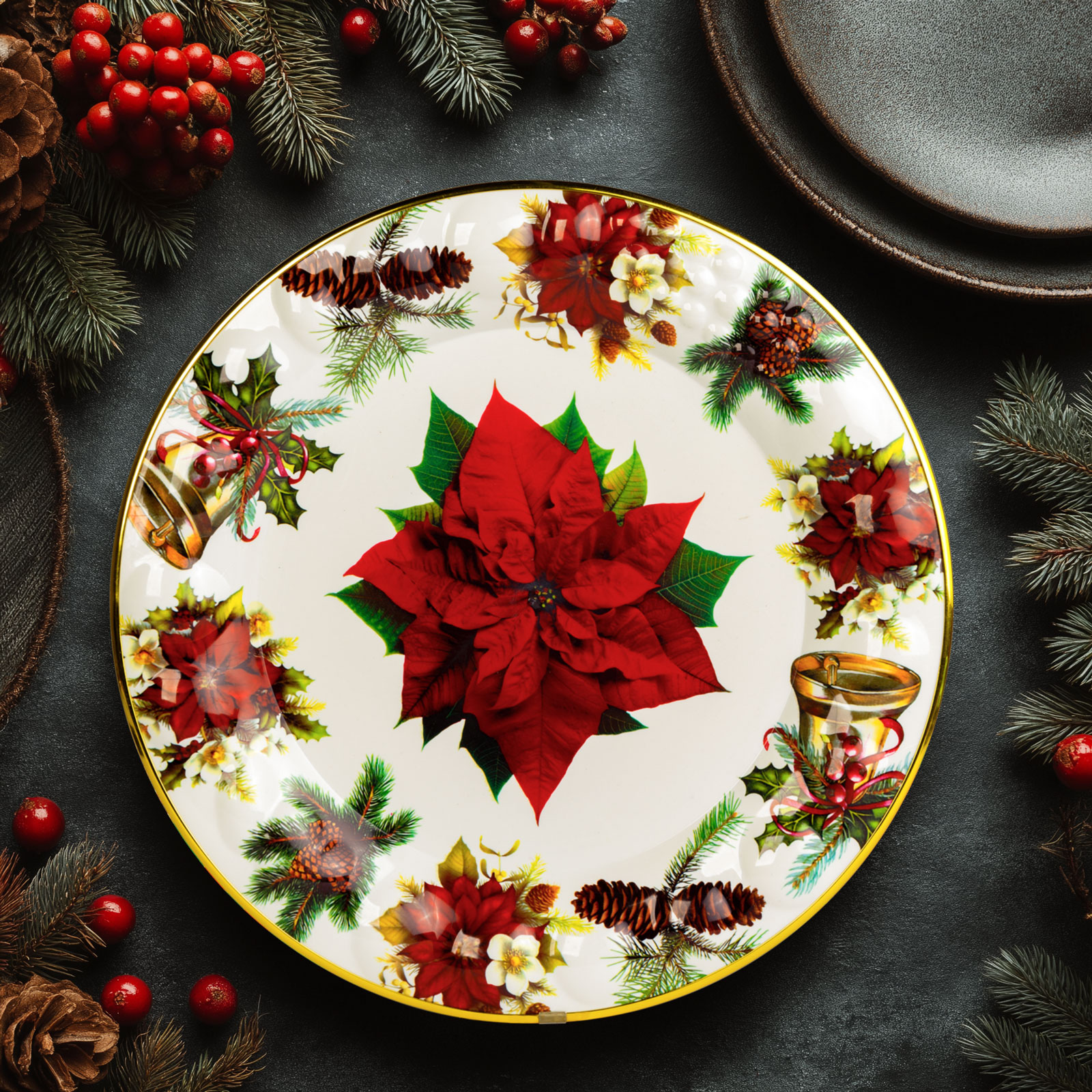 Tento štýlový vianočný tanier s veselým sviatočným motívom je dokonalou voľbou na ozdobenie sviatočného stola. Tanier s priemerom 37,5 cm je ozdobený vianočnou ružou a klasickými vianočnými motívmi – vianočná ruža, vetvičky, šišky. Vyrobený je z odolného plastu s obsahom melamínu, takže je ľahký, ale zároveň pevný a ideálny na podávanie koláčov, sušienok alebo predjedál počas sviatkov.