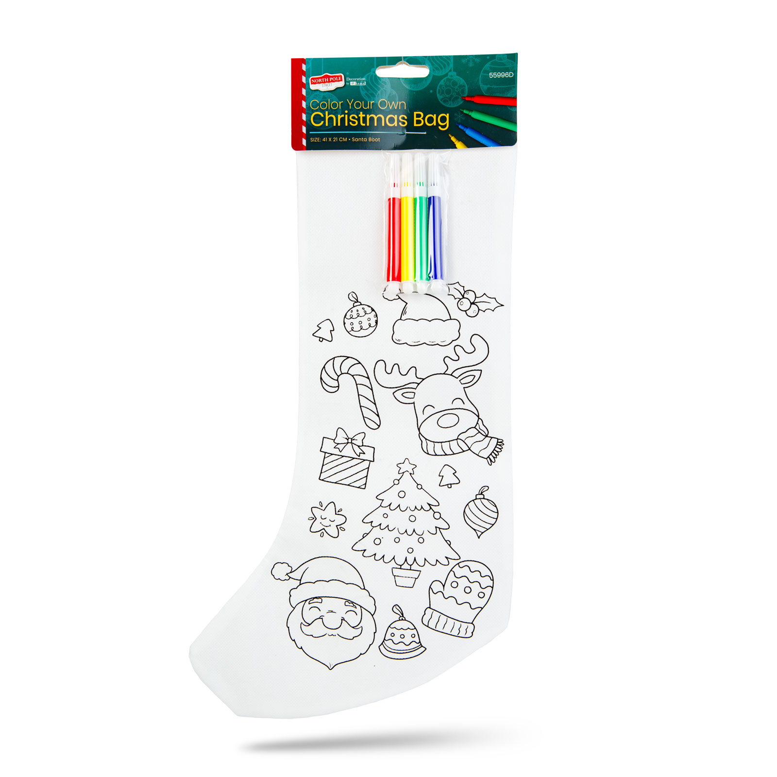 Vyfarbite si vlastnú mikulášsku ponožku pomocou sady farebných fixiek! Dva v jednom: mikulášska ponožka a zábavná aktivita pre deti. Pri vyfarbovaní vložte medzi dve vrstvy látky hrubší papier, aby sa farba nepreniesla na zadnú stranu.